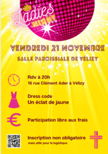Apéro(dînatoire)– topo – disco, voici les 3 composantes de la soirée que nous proposons aux femmes de la paroisse le vendredi 21 novembre, dès 20h.